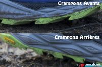 Le matériau de la semelle est confié à la marque « Vibram », gage de qualité. La position des crampons avant et arrière assure une très bonne accroche quelque soit le terrain, d’autant plus qu’elle débourre assez facilement. L’amorti sur les quelques portions de route est très bon, sans l’impression d’avoir 2 boulets aux pieds (292 Gr en taille 42). Cela est du au système N2 pour le moulage de la semelle avec injection d’azote ( N² = Diazote )